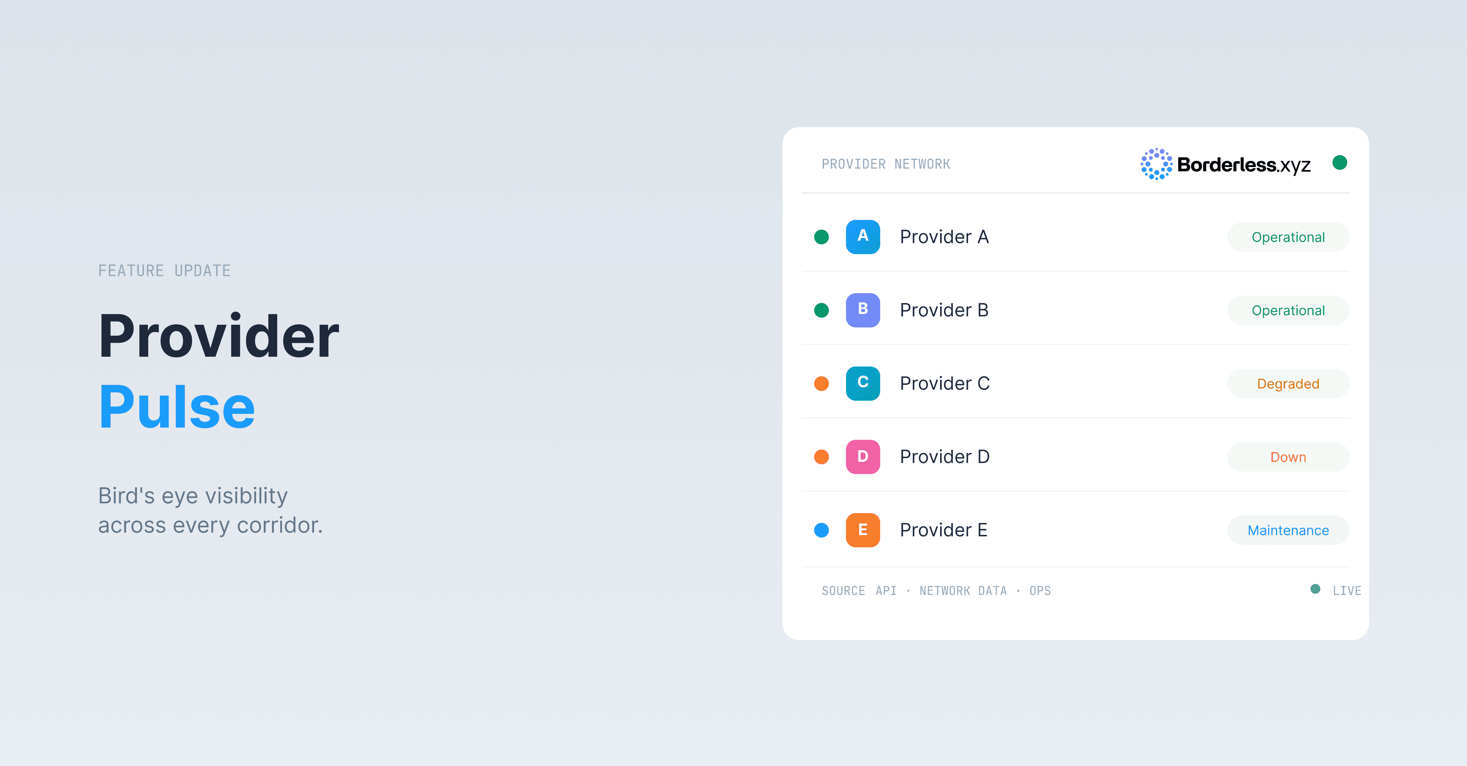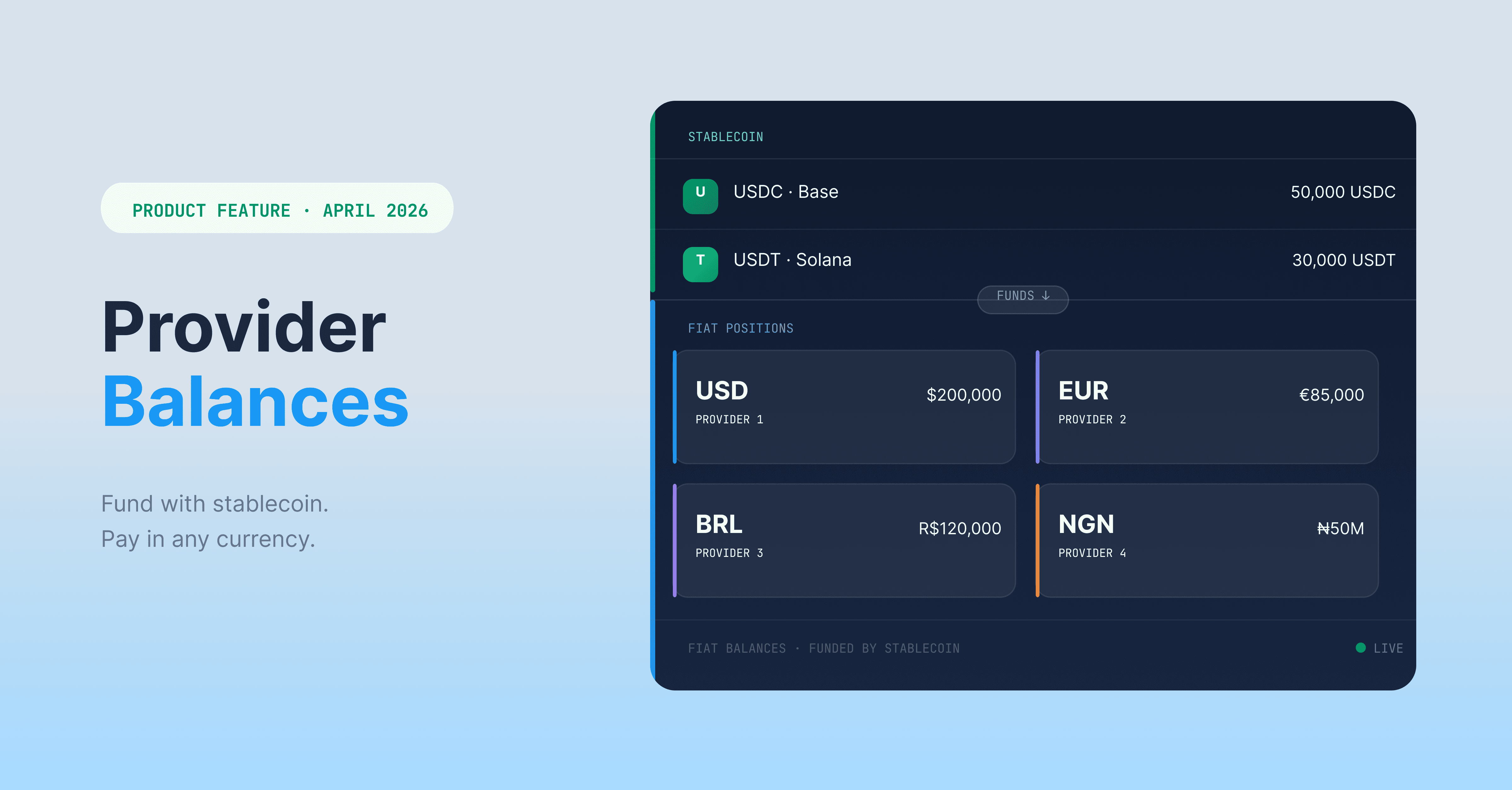 Control the full payment lifecycle across your provider network. Provider selection, FX conversion, local fiat delivery, settlement, and everything in between.