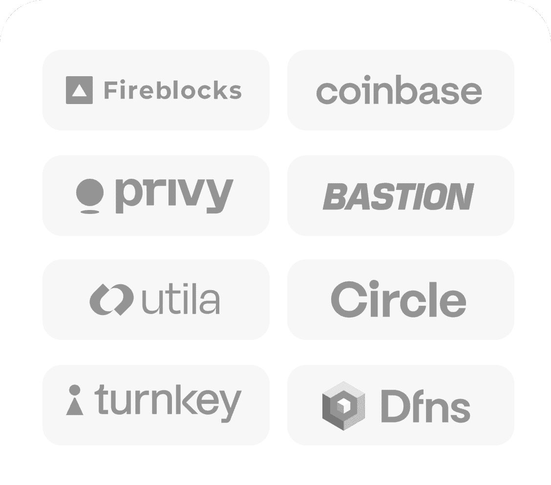 Fireblocks, Dfns, Utila, Privy, Dynamic, Turnkey, and more. Compatible with your existing wallet provider.