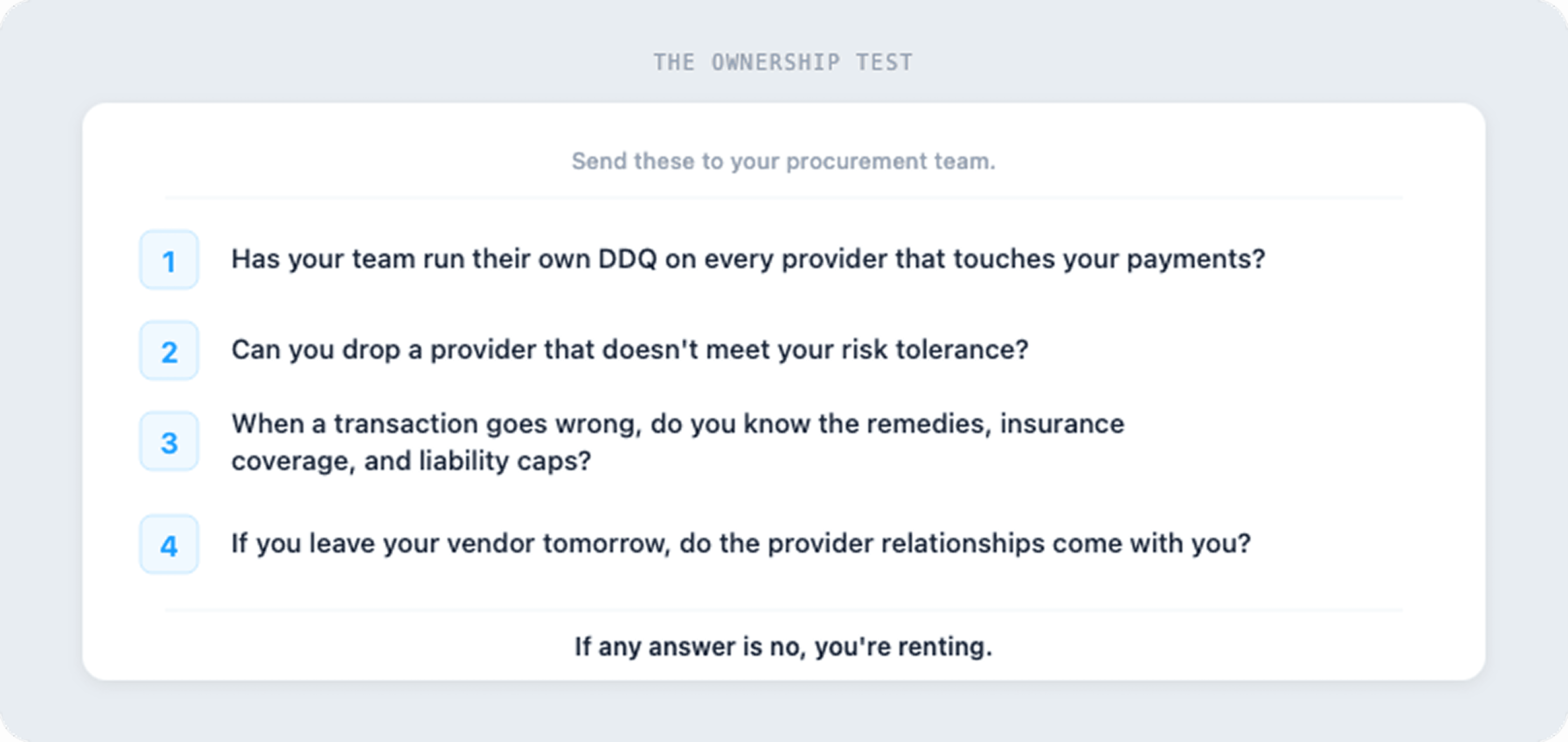 In any other critical vendor relationship, this would be unacceptable. Imagine telling your board that 100% of your payment infrastructure exists inside a single vendor's contract, and you've never spoken to or diligenced the companies that actually move the money. That conversation doesn't go well.