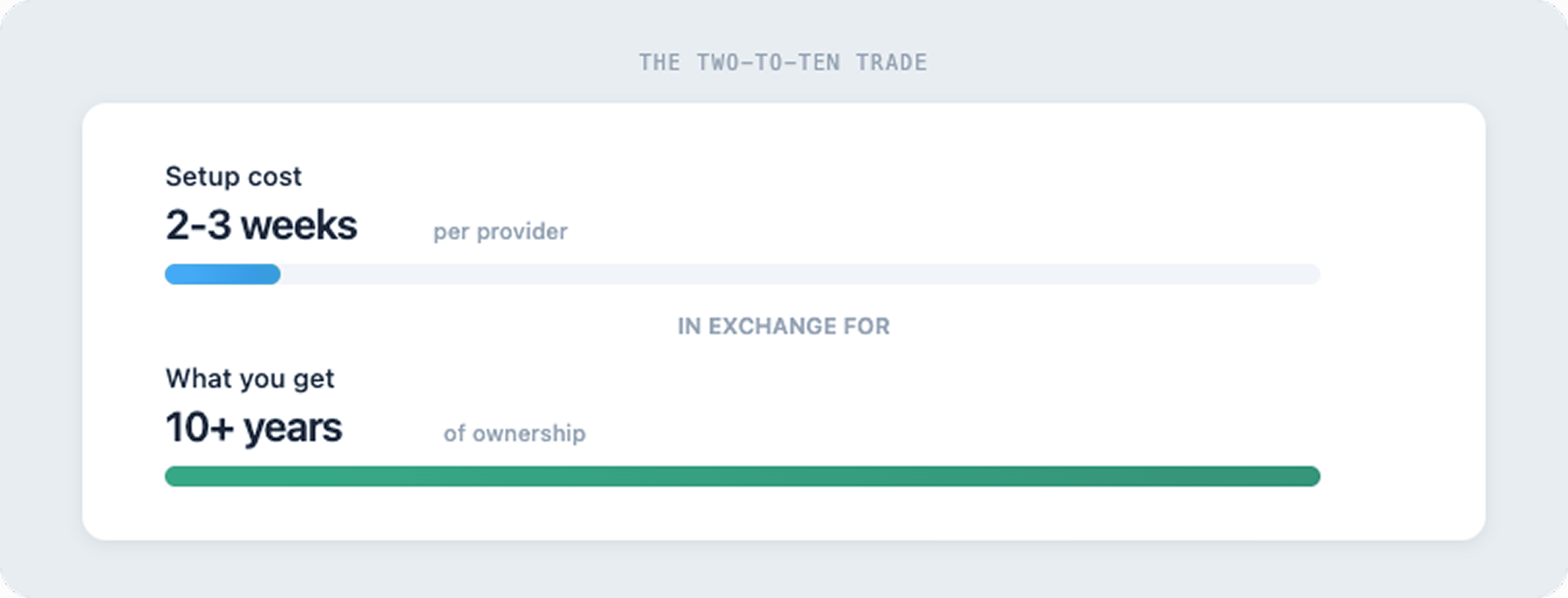 Compare that to the alternative: eight, ten, fifteen years of operating on rails you don't control, governed by terms you didn't negotiate, with counterparties you can't name. Two to three weeks of setup in exchange for a decade of ownership. The ROI is absurdly asymmetric.