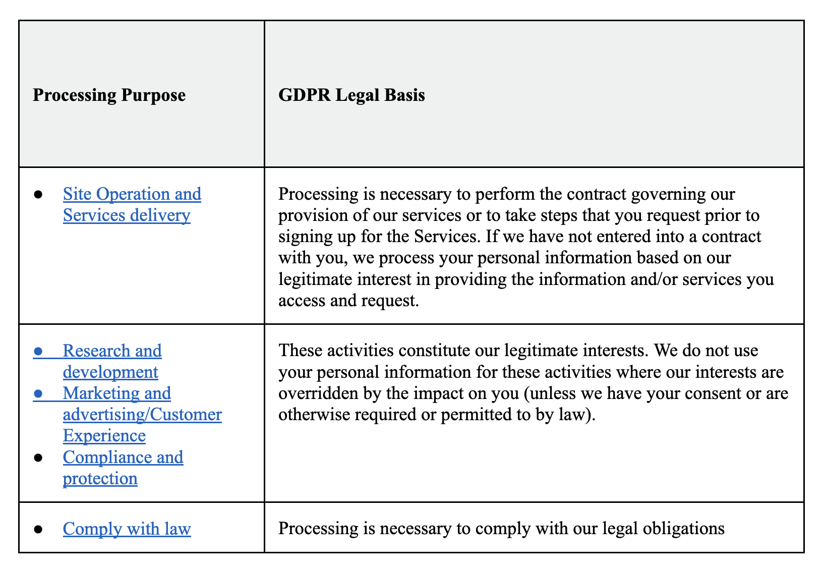 Legal basis for processing. We use your personal information only as permitted by law. Our legal bases for processing the personal information described in this Privacy Policy are described in the table below.